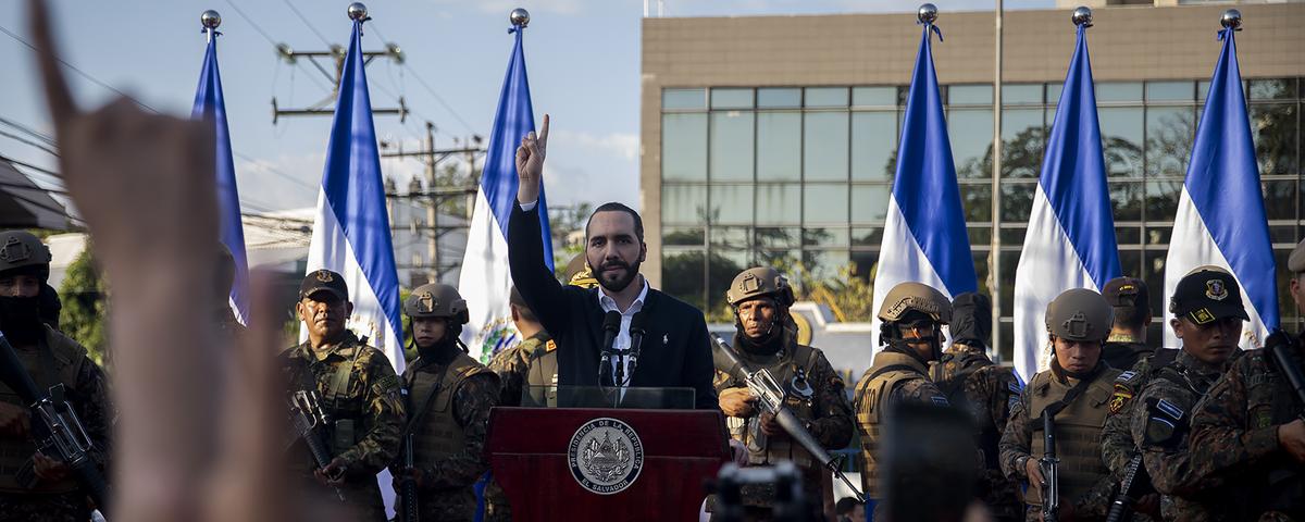 En fin, que Bukele caminaba por la alfombra roja que le habían dispuesto, mientras sonaba la marcha presidencial. Entró por en medio de un pasillo formado por unos cincuenta militares vestidos de gala. Sus guardias privados tenían que abrirle espacio ante las decenas de cámaras que intentaban filmarlo, en el golpe legislativo más elegante y protocolario del que Latinoamérica tenga memoria. Usurpó la silla del presidente del primer órgano de Estado. «Está muy claro quién tiene el control de la situación», dijo mirando a su alrededor. Soldados, cámaras. Faltaba un elemento para tener el retrato más sincrético de Bukele. «Nos vamos a poner en manos de Dios», dijo. Retrato completo. Todo el despliegue estaba listo, solo faltaba empezar el show: cerró los ojos, juntó sus manos como un cuenco frente a su rostro, aceleró la respiración, apenas movió los labios, como murmurando, frunció el ceño, se llevó las manos al rostro, los pequeños espasmos indicaban que Bukele lloraba, sus manos temblaron sutilmente, parecía secarse unas lágrimas que nunca terminaron de aparecer, miró hacia el cielo. Se levantó y, así como entró, salió.